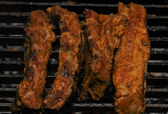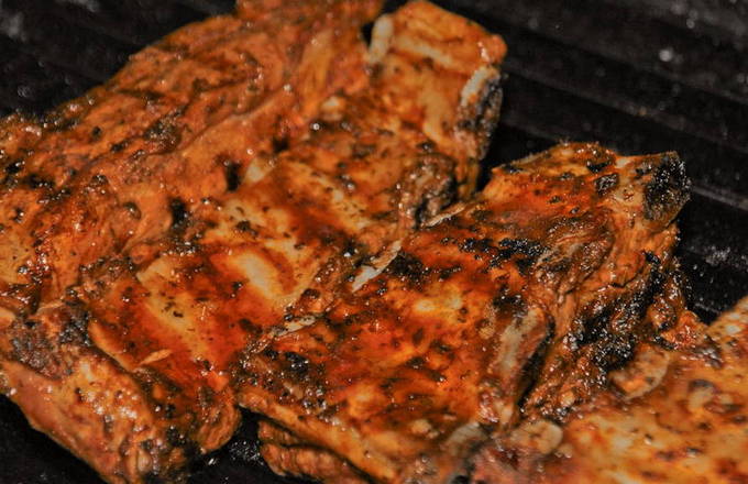 Varkensribbetjes op de grill in honing-mosterdmarinade