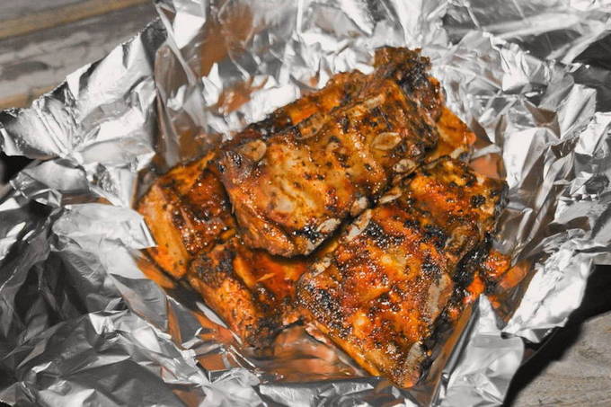 Sappige varkensribbetjes in folie op de grill