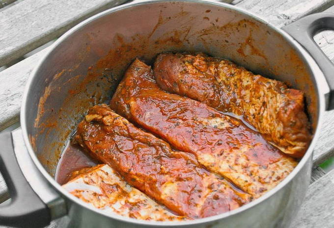 Het zoete en malse ribvlees zal je aangenaam verrassen bij het kiezen van dit recept. De gelijktijdige scherpte en zoetheid van de marinade geeft het varkensvlees een ongewone en uiterst verfijnde smaak die elke picknick perfect zal versieren.