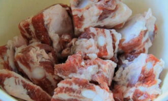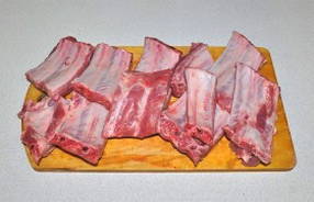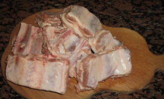 - We wassen de ribben, drogen ze af met een handdoek en snijden ze in stukken van 2-3 ribben.