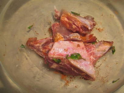 - Zout de ribben en voeg er greens aan toe. Bestrooi vervolgens met kruiden en meng grondig. Laat de ribben iets meer dan 2 uur marineren.
