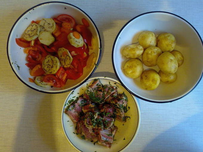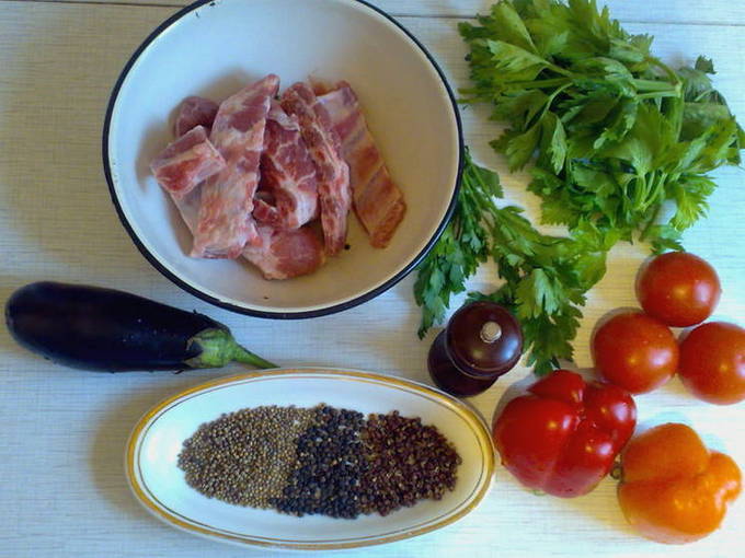 - We halen de stelen uit de paprika's, snijden ze in blokjes. Verwijder de schil van de tomaten, snijd ze in plakjes. Verwijder ook het vel van de aubergine en snij in plakjes. Snijd de wortelen in cirkels. We mengen groenten, zouten ze. We wassen de aardappelen en voegen ook wat zout toe.