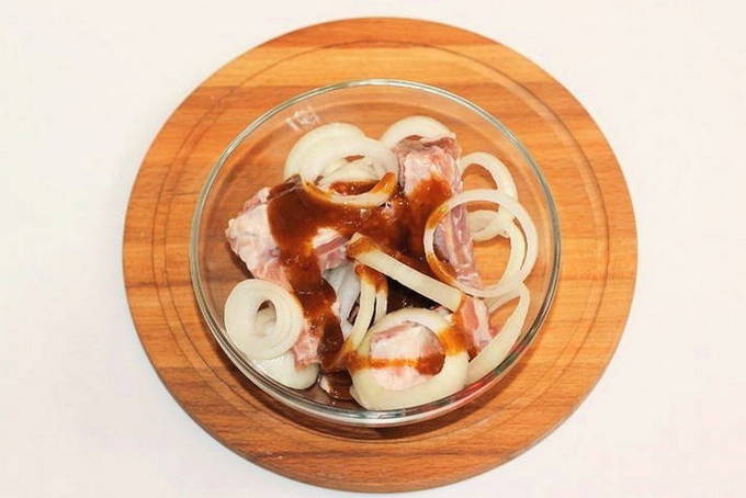 - We wassen en drogen de ribben, snijden ze in porties. Voeg in ringen gesneden ui, kebabketchup toe en meng. Laat de spareribs minimaal 3 uur in de koelkast marineren.