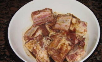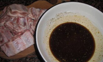 - Snijd de ribben in stukjes en vul ze met knoflook. Bereid de saus door de twee hoofdingrediënten te mengen. Voeg ui en kruiden toe, meng grondig. Overgiet de spareribs met saus en laat minimaal een uur in de koelkast staan.