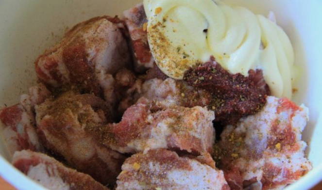 - Voeg adjika, mayonaise, kruiden en zout toe. Roer en laat de ribben staan. Hoe langer, hoe malser het vlees eruit komt.