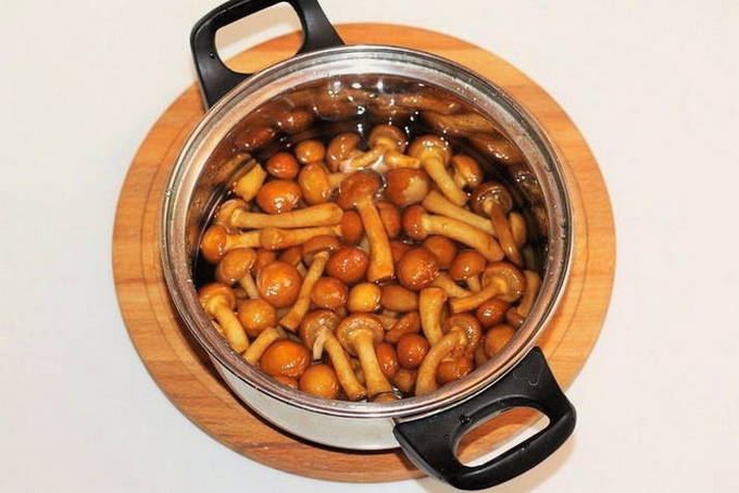 - We wassen de champignons, gieten ze in kokend water, zout, voegen peperkorrels en laurierblaadjes toe. Kook 35 minuten, giet het water af.