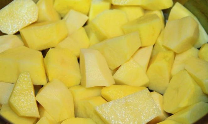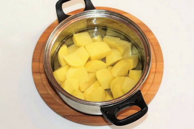 - We schillen de aardappelen, snijden ze in grote plakjes. Kook de aardappelen in gezouten water ongeveer 10-15 minuten. Hij zou in een semi-ready staat moeten zijn. We laten het water weglopen.