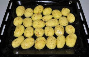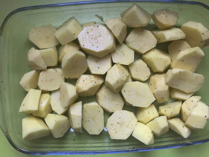 - Schil middelgrote aardappelknollen, snijd ze in twee helften. Doe de gesneden aardappelen in een kom en overgiet met olie.Leg het op een bakplaat en bestrooi met zout en peper.