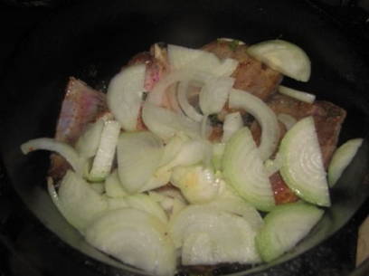 - Snijd de ui in halve ringen. Aanbrengen op het vlees en goudbruin bakken.