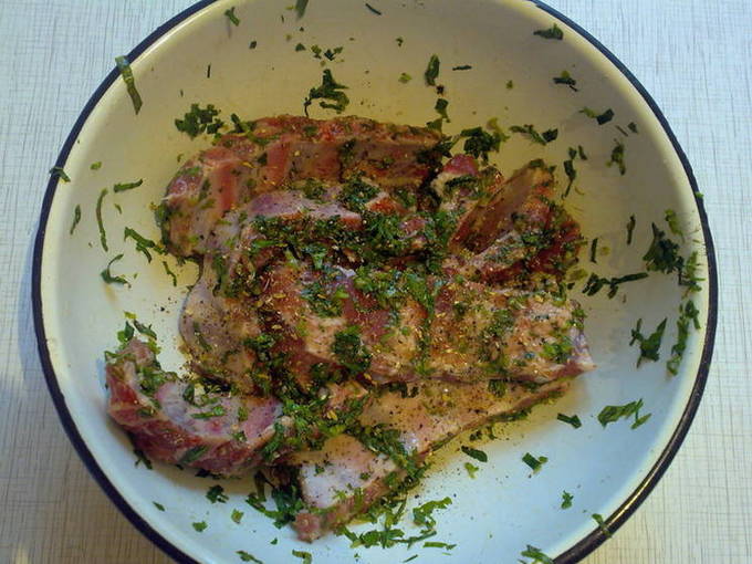 - Snijd de ribben in stukken zodat elk stuk een bot en het omringende vlees bevat. Bestrooi ze met zout, peper, paprikapoeder en basilicum. Wrijf de kruiden in het vlees en zet het in de koelkast om 1,5-2 uur te marineren.