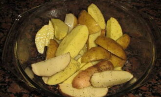 Bereid de aardappelen voor het bakken. Was het goed, snijd het in vieren. Je hoeft de aardappelen niet te schillen. Bestrooi het met zout, peper en olie.