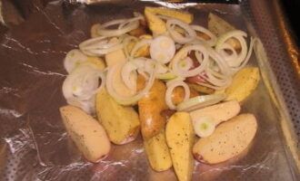Bekleed de bakplaat met folie zodat deze kleine zijkanten vormt. Leg de aardappelen op de folie, leg de geschilde en gesneden uien erop.