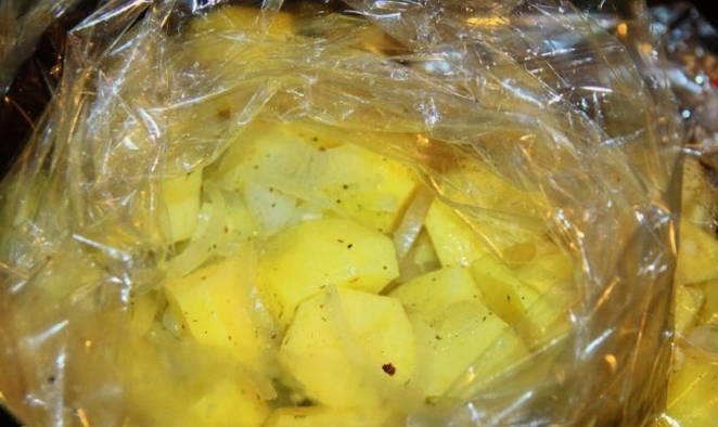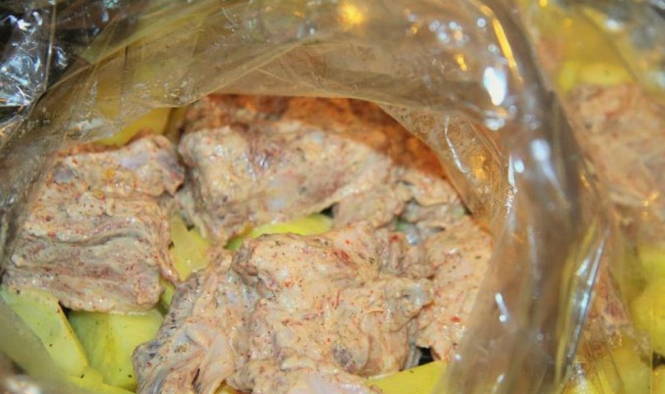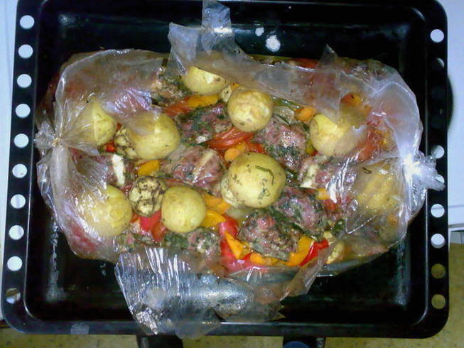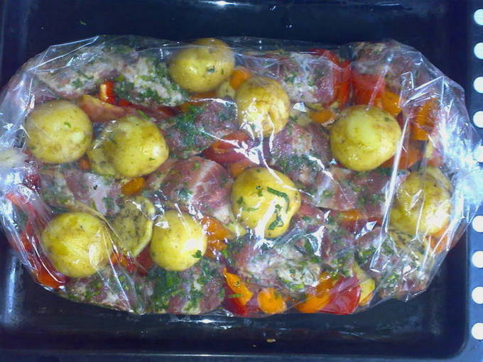 - We stoppen groenten in de hoes en verdelen ze over de hele lengte. We verdelen ook eerst de ribben en daarna de aardappelen. We binden de mouw en sturen deze naar de oven, verwarmd tot 170 graden.