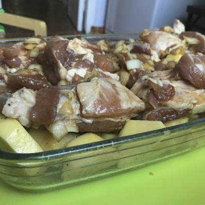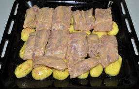 - Leg de ribben op de aardappelen. Verwarm de oven voor op 190 graden en laat het gerecht ongeveer een uur bakken. Eet smakelijk!