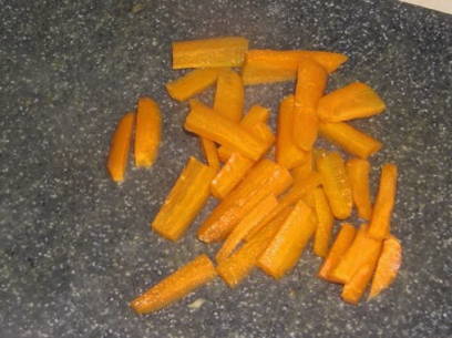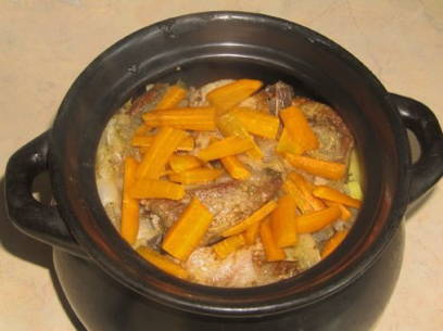 - Sudder de ribben, afgedekt op laag vuur gedurende ongeveer 20 minuten. Wortel in reepjes snijden.