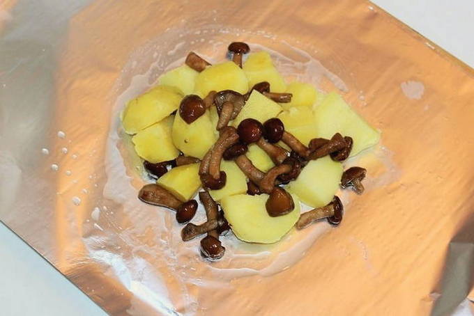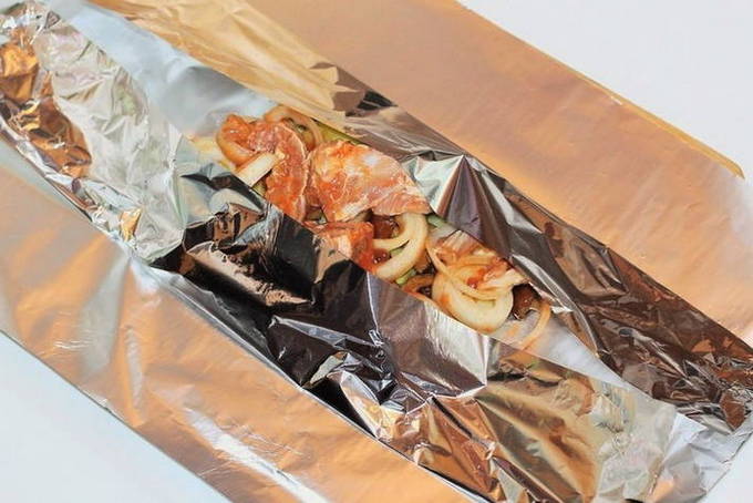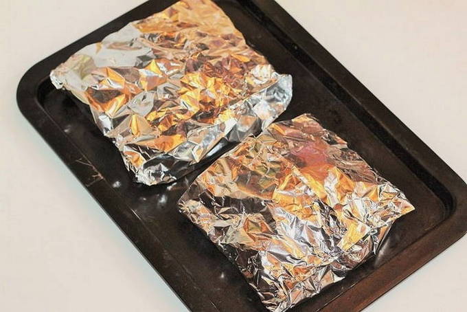 - Snijd de dikke folie in stukken van 30 bij 40. Als er geen dikke folie is, kun je twee lagen dunne folie nemen. Het aantal stuks folie is gelijk aan het aantal porties. Smeer toekomstige enveloppen met plantaardige olie en leg op elk een gelijke hoeveelheid vulling.