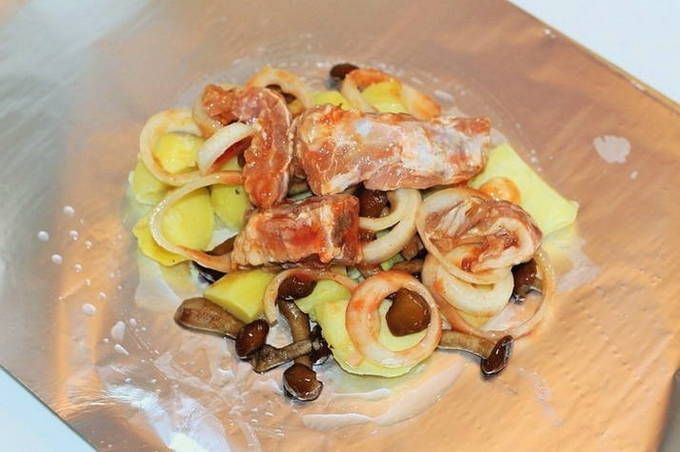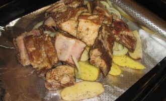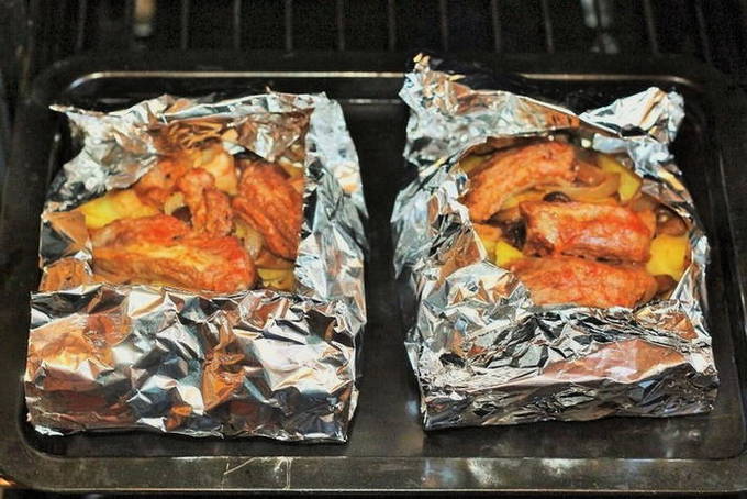 Hoe varkensribbetjes met aardappelen in folie in de oven bakken?