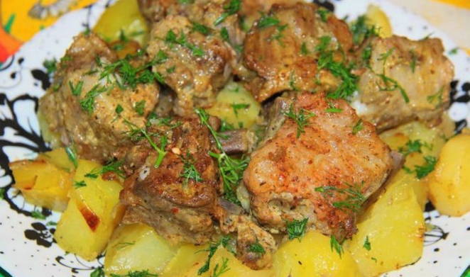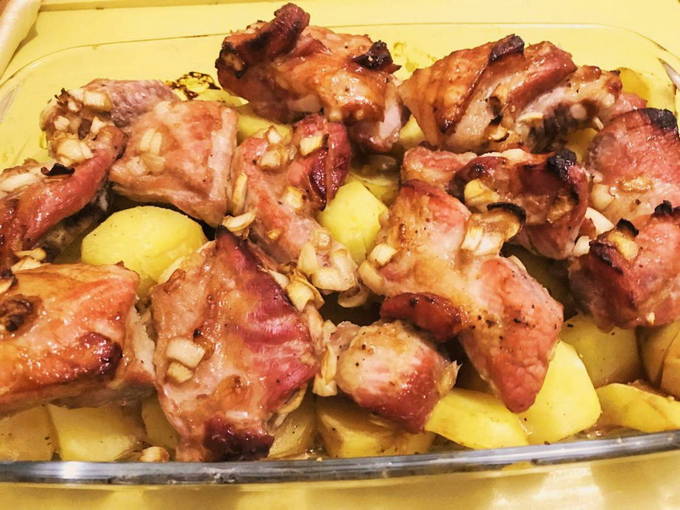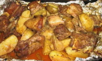 Een klassiek en zeer eenvoudig recept voor spareribs met aardappelen. Het varkensvlees blijkt mals, sappig en aromatisch te zijn, en de stevige aardappelen zullen het vlees perfect aanvullen en je een aangenaam verzadigd gevoel geven.