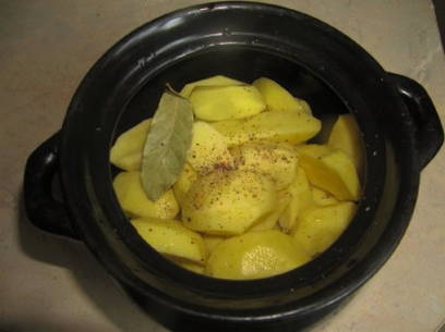 - Spreid een derde van de pan uit met een laag aardappelen. Peper, zout en voeg het laurierblad toe.