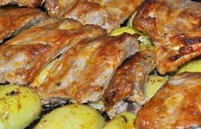Malse, sappige ribben in het gezelschap van aardappelen gedrenkt in vet zullen niemand onverschillig laten. Het recept is vrij eenvoudig en het is gemakkelijk om de ingrediënten in uw plaatselijke supermarkt te vinden.