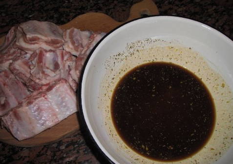 - Snijd de ribben in stukjes en vul ze met knoflook. Bereid de saus door de twee hoofdingrediënten te mengen. Voeg ui en kruiden toe, meng grondig. Overgiet de spareribs met saus en laat minimaal een uur in de koelkast staan.