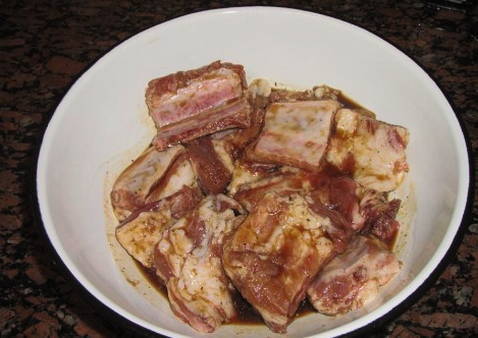 Marineer de ribben. We dopen hun marinade en laten ze 2 uur sudderen.