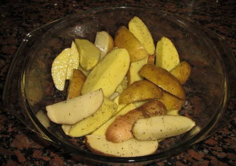 - Schil middelgrote aardappelknollen, snijd ze in twee helften. Doe de gesneden aardappelen in een kom en overgiet met olie.Leg het op een bakplaat en bestrooi met zout en peper.