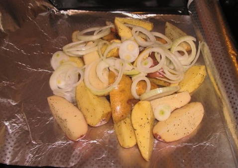 Bekleed de bakplaat met folie zodat deze kleine zijkanten vormt. Leg de aardappelen op de folie, leg de geschilde en gesneden uien erop.