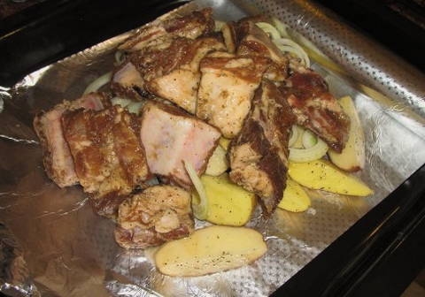 Een klassiek en zeer eenvoudig recept voor spareribs met aardappelen. Het varkensvlees blijkt mals, sappig en aromatisch te zijn, en de stevige aardappelen zullen het vlees perfect aanvullen en je een aangenaam verzadigd gevoel geven.
