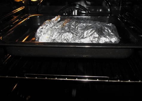 Bedek de schaal met folie en stuur deze naar de voorverwarmde oven op 180 graden. Bak een uur, open dan de folie, giet sojasaus over de schaal en bak nog eens 40 minuten.
