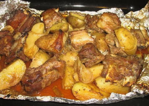 Hoe varkensribbetjes met aardappelen in folie in de oven bakken?