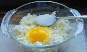 Voeg een ei, suiker, een beetje zout en vanilline toe aan de wrongel en voeg rijstmeel toe. Meng de massa goed, het deeg mag niet te dicht zijn.