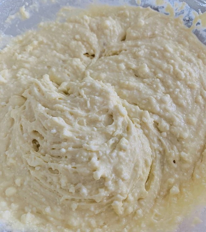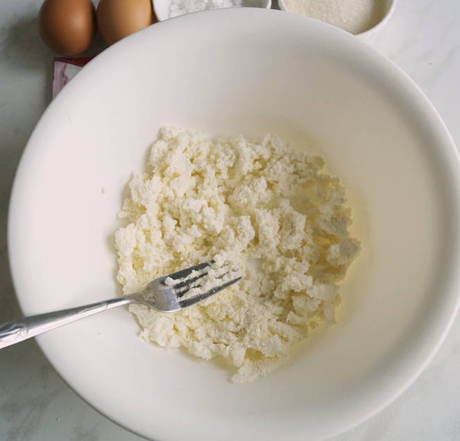 - Cottage cheese wordt apart gekneed met een vork en toegevoegd aan het ei-suiker mengsel.