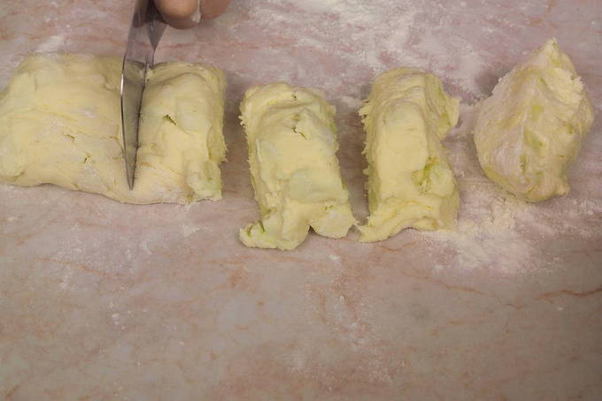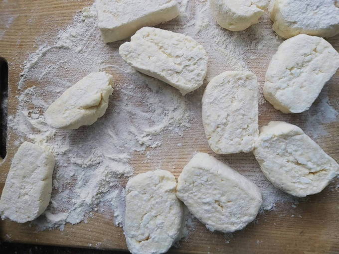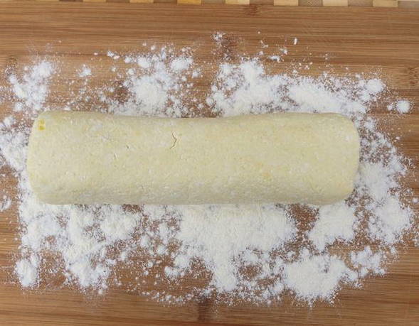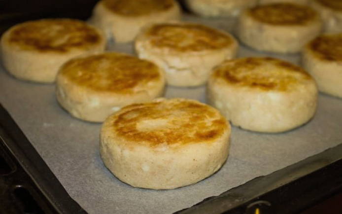 Rol een worst van het resulterende deeg, verdeel in geportioneerde stukken en vorm cheesecakes, bestrooi ze licht met bloem zodat ze niet aan je handen blijven plakken.