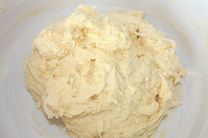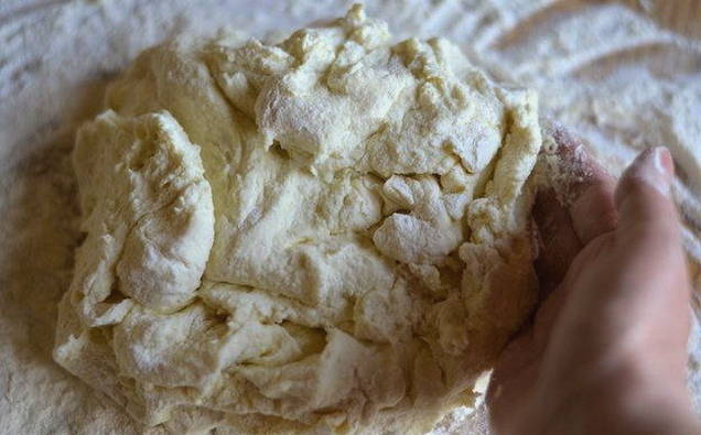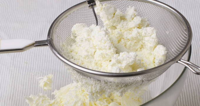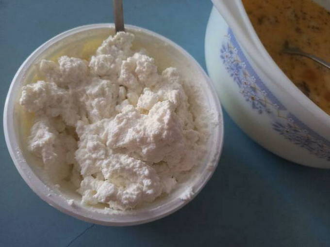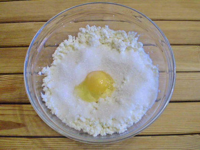 - Aan de wrongelmassa wordt een beetje zout, zoetstof en rijstmeel toegevoegd. Meng het deeg grondig en laat het enkele uren in de koelkast staan.