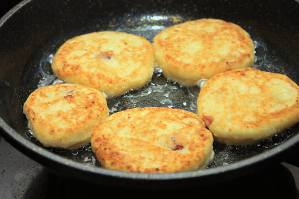 - Syrniki worden in plantaardige olie in een goed verwarmde koekenpan goudbruin gebakken.
