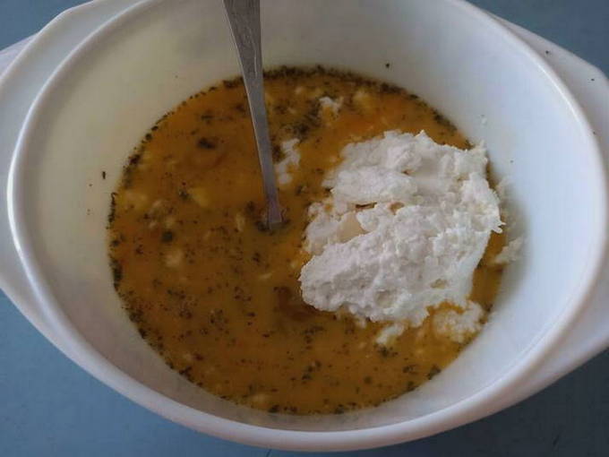 - Kneed de kwark in een diepe kom en drijf er een ei in. De massa wordt gemengd zodat deze homogeen wordt.