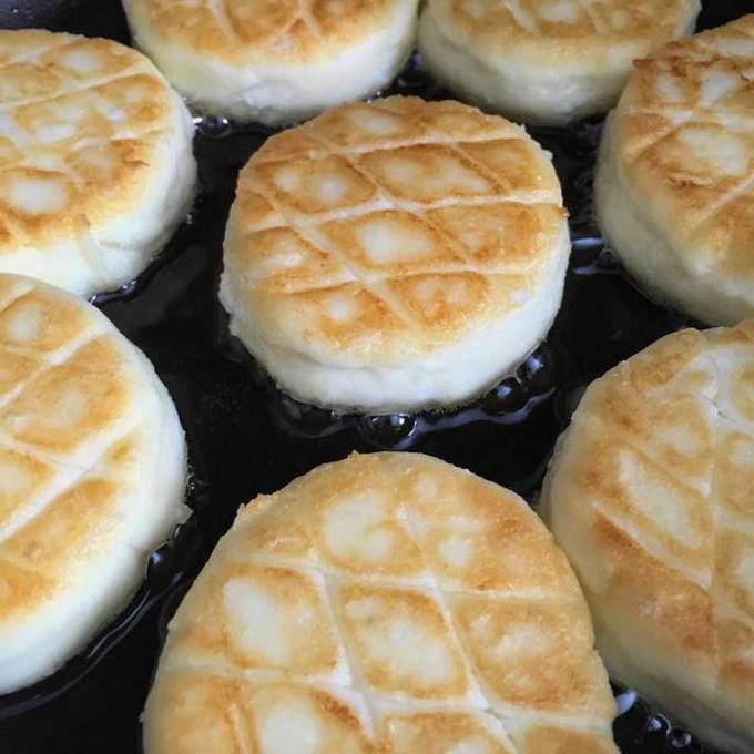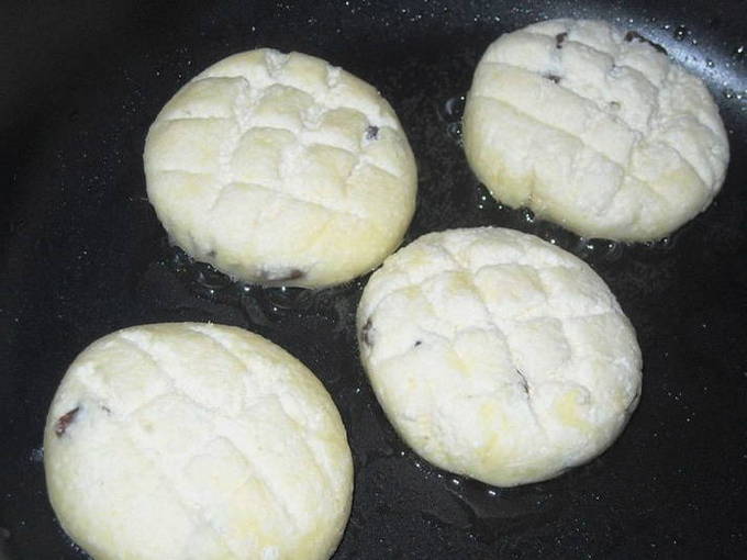 - Van de resulterende massa worden cheesecakes gebeeldhouwd, die ze aan alle kanten in bloem rollen.