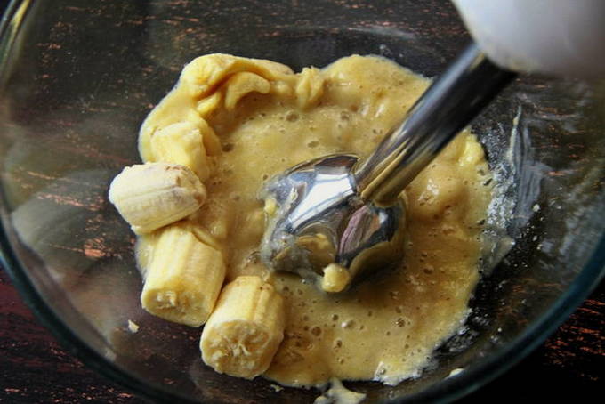 - Voeg bananenpuree toe aan het wrongeldeeg, meng goed.