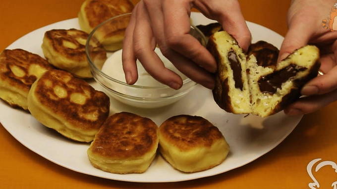 - Een beetje bloem wordt op een snijplank gegoten. Van het wrongeldeeg wordt een bal gevormd, een stuk chocolade wordt erin gedaan, de bal wordt in bloem gedompeld en met een druppel olie in een pan van alle kanten gebakken.