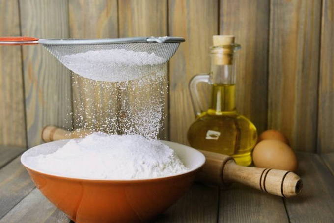 - Rijstmeel wordt gezeefd en aan de wrongel toegevoegd, goed gemengd tot een homogeen deeg.