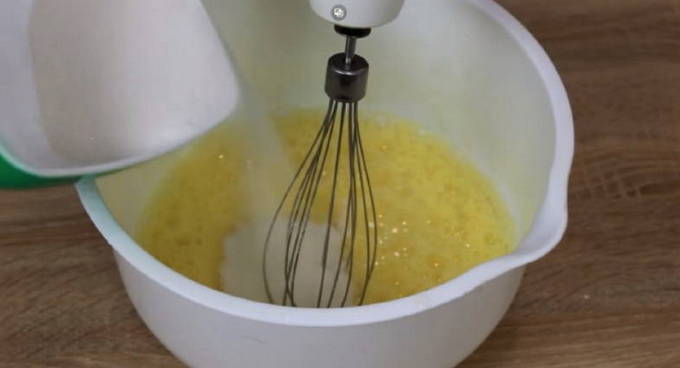 - Klop de eieren met suiker in een diepe kom.