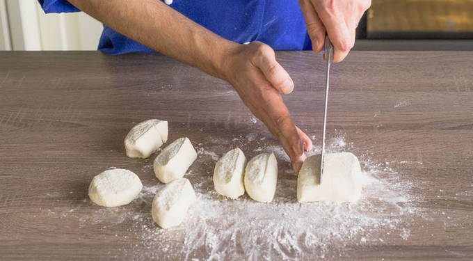 - Een beetje bloem wordt op een snijplank gegoten. Van het wrongeldeeg wordt een bal gevormd, een stuk chocolade wordt erin gedaan, de bal wordt in bloem gedompeld en met een druppel olie in een pan van alle kanten gebakken.