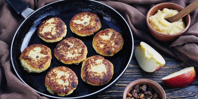 - Syrniki worden in plantaardige olie in een goed verwarmde koekenpan goudbruin gebakken.