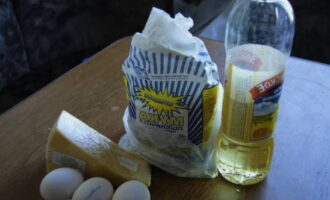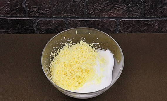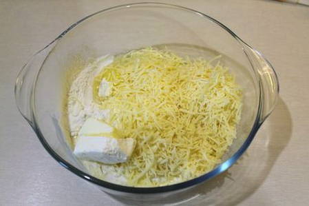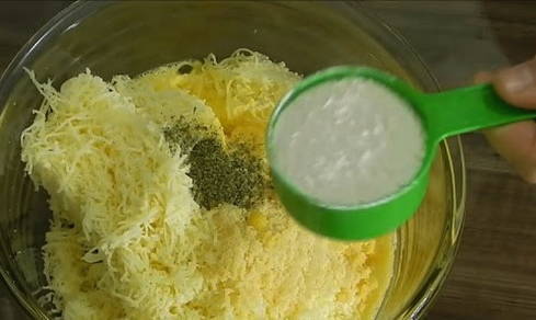 - Wrijf voor het deeg de kaas op een grove of middelgrote rasp. Combineer het met ei, zout, kruiden en bloem. Roer de massa goed door.