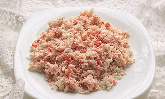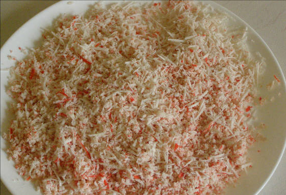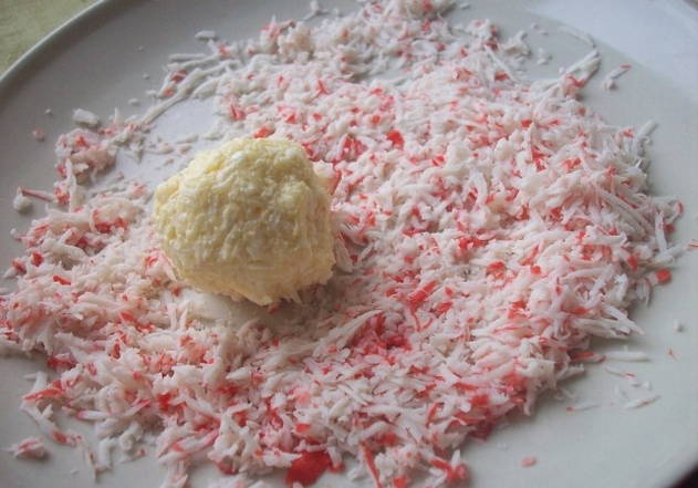 - Gebruik de resterende geraspte krabsticks om te besprenkelen. We "lijmen" de ballen stevig met het product.