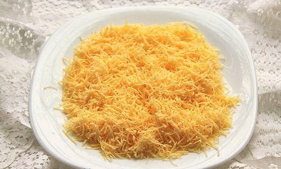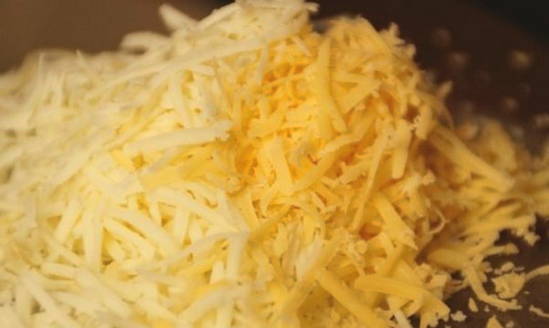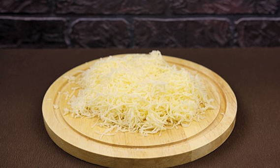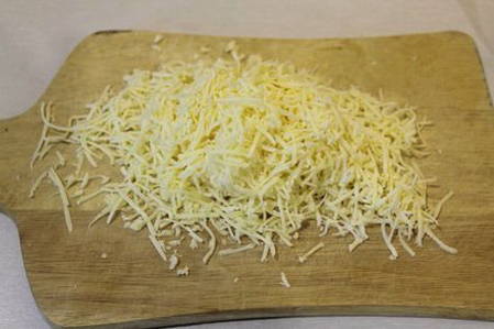 Laten we naar het proces gaan. Wrijf eerst harde kaas. Het is aan te raden hiervoor een fijngetande rasp te gebruiken.