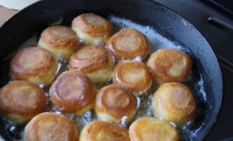 - We zetten de friteuse aan of gebruiken in plaats daarvan een pan met veel olie. We dompelen de blanco's onder in het kokende product met behulp van een schuimspaan. Koken gedurende 3-4 minuten.