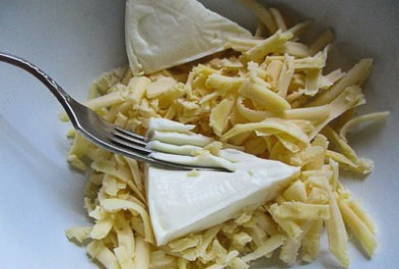 - We verspreiden de smeltkaas tot harde kaas. Kneed het product met een vork. Wij mixen.
