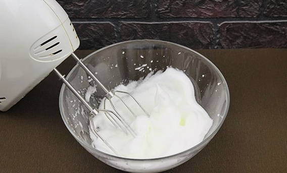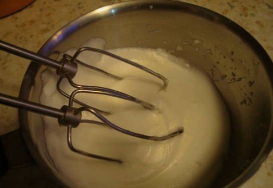 - Daarna scheiden we de dooiers van de eiwitten. We gebruiken alleen eiwitten. Klop ze tot een dikke en donzige massa is gevormd.